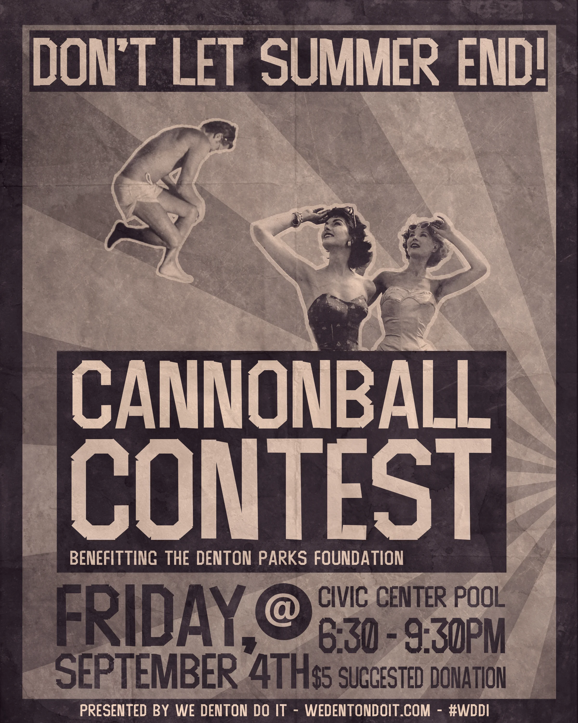 Come out and join us Friday, September 4th at 6:30pm as we bounce good bye to the diving boards, and usher in a new park to make more memories on by entering our cannonball contest, as each entry is a chance to donate to the Denton Parks Foundation and the new Eureka 2 Playground. Amongst our local celebrities bouncing for glory will Jupiter House owner and city councilman Joey Hawkins, Denton ISD Superintendent Jamie Wilson, Kevin Roden, Greg Johnson, Gary Henderson, Hank Dickenson and more. So come out, swim to your hearts content, cheer on our contenders as they show us their best cannonball form, or show them up with your own awesome cannonball! Entrance to the pool is a suggested $5 donation and we just kindly ask that you make an additional donation to show off your sweet cannonball skillz. All proceeds go to the Denton Parks Foundation.