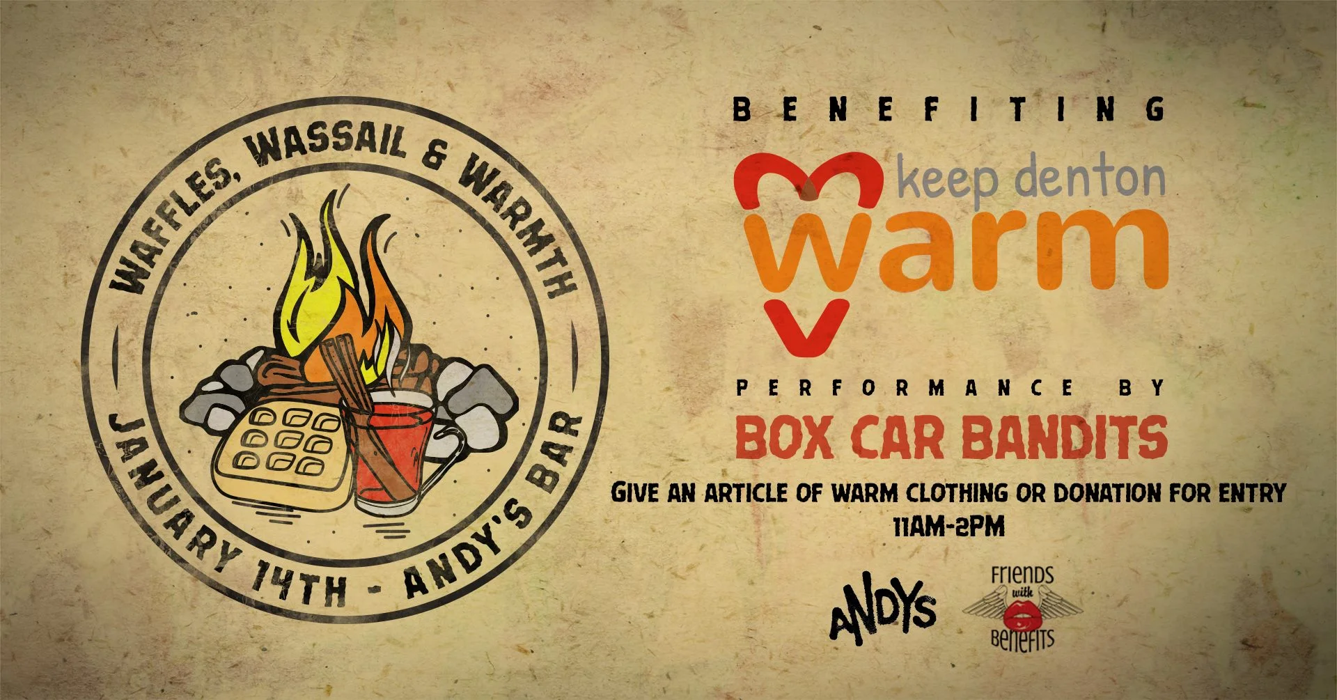 As the temperature drops, there are many Dentonites without adequately warm clothing, so let’s eat waffles, drink wassail, and watch wonderful music from Boxcar Bandits at this benefit for Keep Denton Warm and Friends with Benefits.