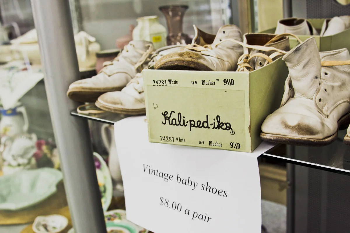 Vintage baby shoes sit on a shelf in Ruth's Room off of University.